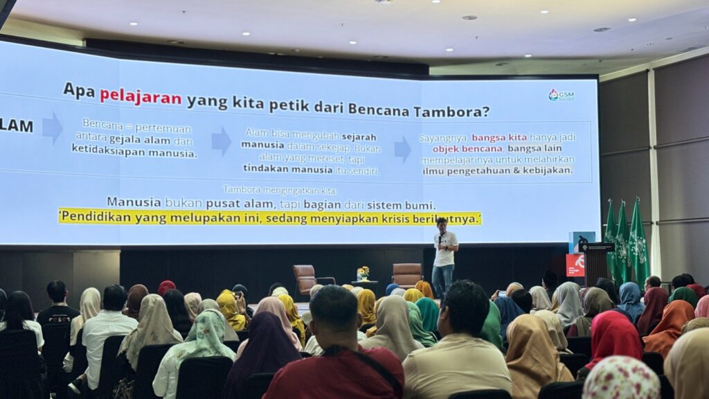 Pertama-tama, para guru diajak melihat ulang sejarah meletusnya Gunung Tambora pada tahun 1815. Sebuah peristiwa yang memicu pendinginan global, “The year without summer”, gagal panen, krisis pangan, hingga instabilitas politik di Eropa dan Amerika Utara.